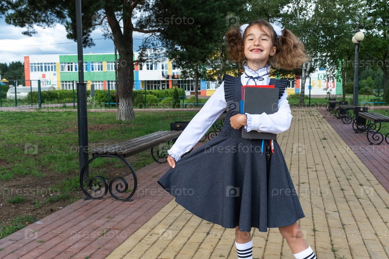Девушка с рюкзаком, школьной формой с белыми бантами и стопкой книг возле школы. Снова в школу, счастливый ученик, тяжелые учебники. Образование, классы начальной школы, 1 сентября