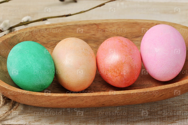 Крашеные пасхальные яйца в деревянной тарелке