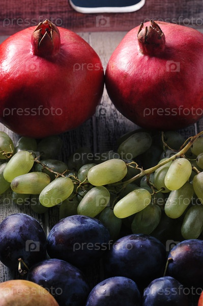 Фрукты на деревянном подносе - гранаты, виноград, сливы