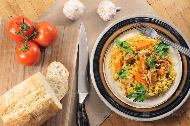 Плов в тарелке — блюдо с мясом, морковью и рисом