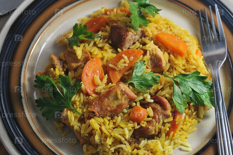 Плов в тарелке — блюдо с мясом, морковью и рисом