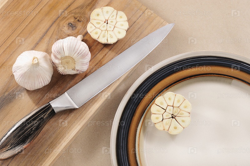 Фото натюрморта с чесноком - чеснок целый и разрезанный пополам