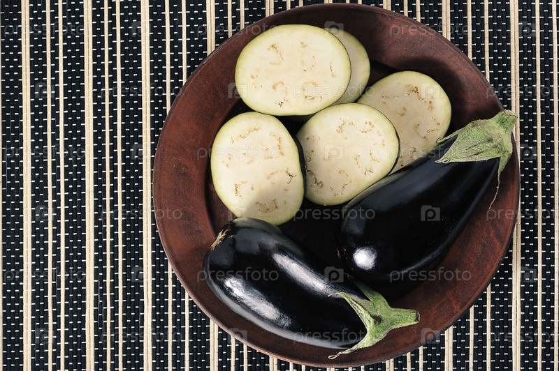 Целые баклажаны и нарезанные баклажаны на тарелке — вид сверху