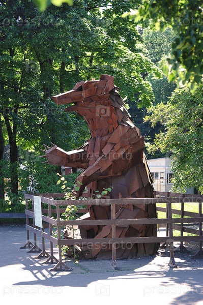 Вид на железную скульптуру медведя на Воробьевой набережной в Москве