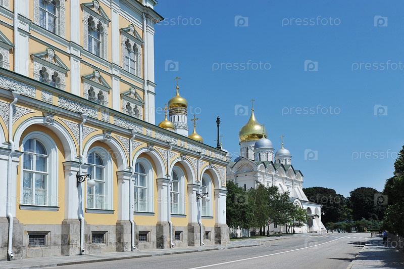 Вид на золотые купола на Соборной площади Кремля в Москве