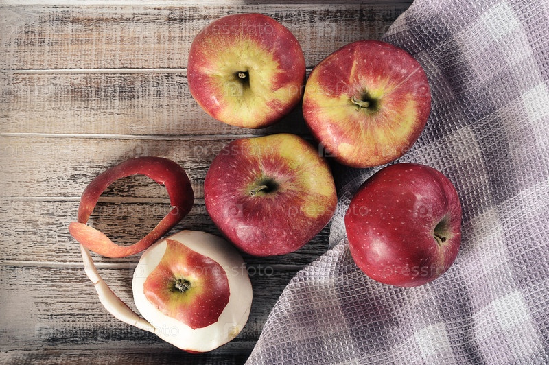 Красные яблоки на деревянном фоне — вид сверху