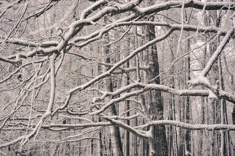 Ветки деревьев после снегопада – в снег и мороз