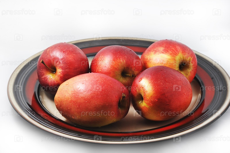 Красные продолговатые яблоки на тарелке с красной каймой