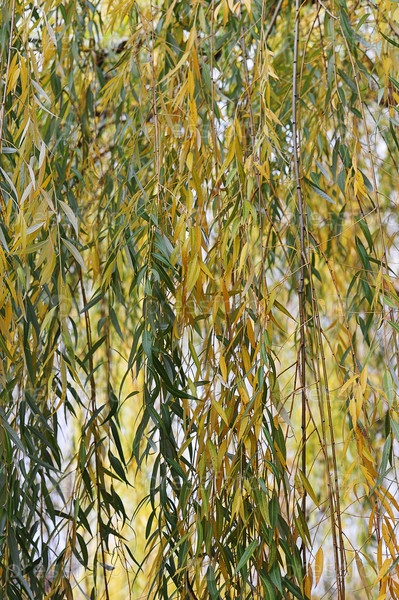 Осенний фон из желтых и зеленых листьев плакучей ивы