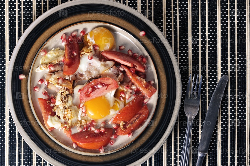 Завтрак на тарелке - бекон с помидорами и яйцами - вид сверху