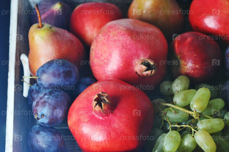 Фруктовая тарелка - сливы, груши, яблоки, гранаты, виноград, инжир