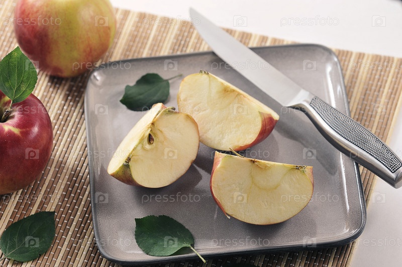Спелые красные яблоки и нарезать ломтиками вместе с листиком