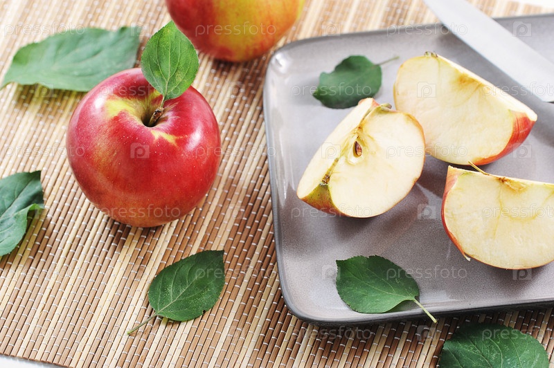 Спелые красные яблоки и нарезать ломтиками вместе с листиком
