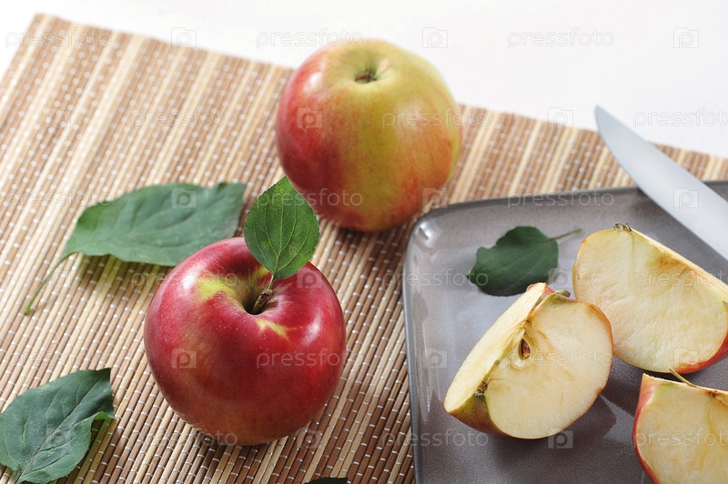 Спелые красные яблоки и нарезать ломтиками вместе с листиком