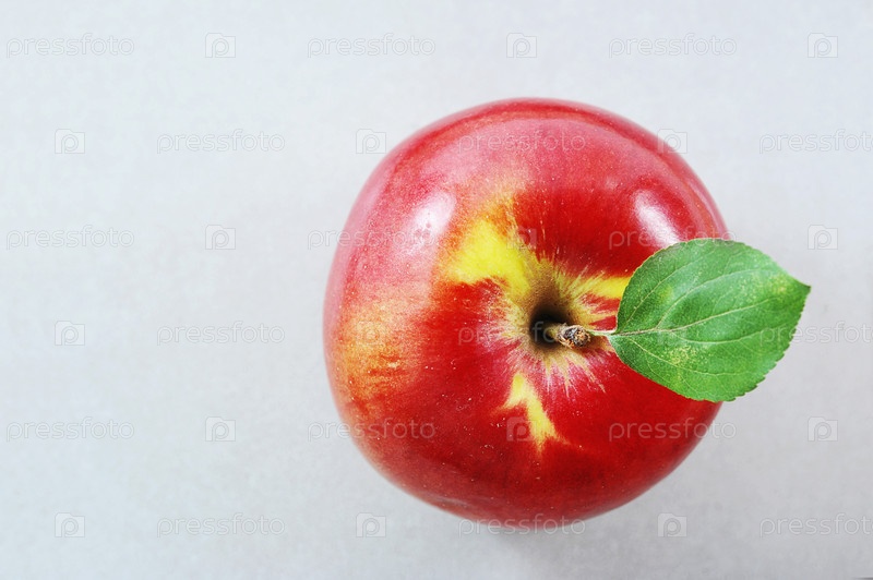 Спелое красное яблоко с зеленым листом