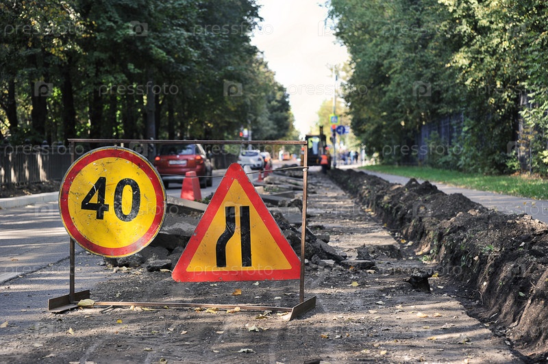 Дорожные знаки и брусчатка вдоль Измайловского бульвара в Москве, Россия