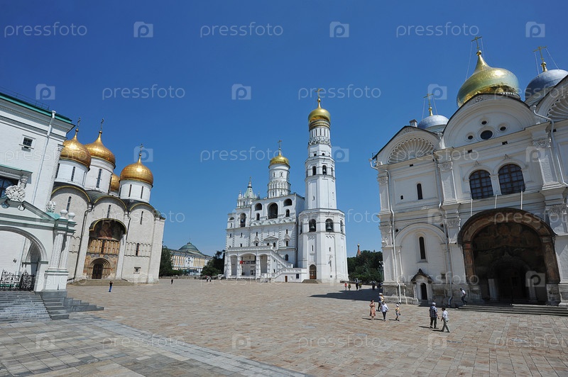 Вид на церкви и звонницы на Соборной площади Кремля в Москве