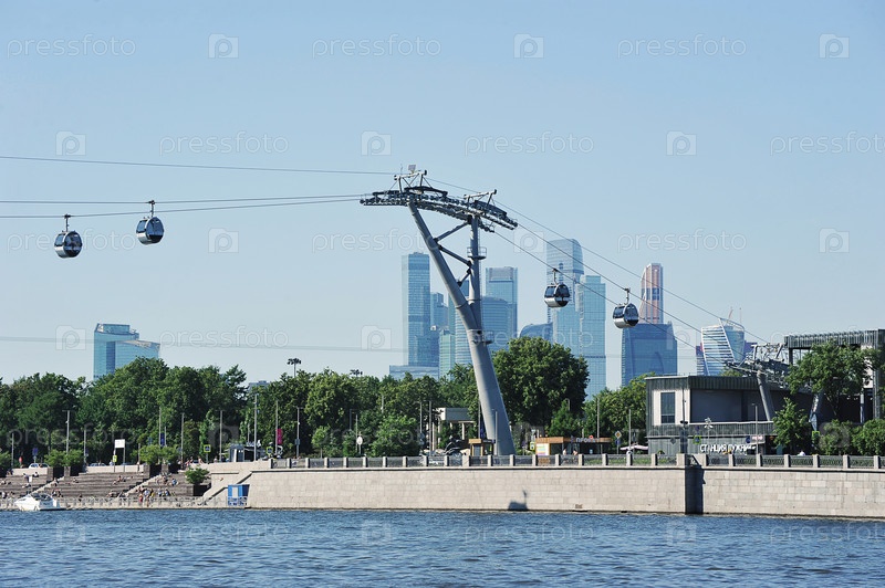 Опора подвесной канатной дороги в Лужниках на фоне высотных зданий делового района Москва-сити в Москве