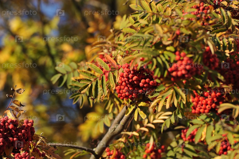 Пучки красной рябины с осенними листьями – время сбора урожая