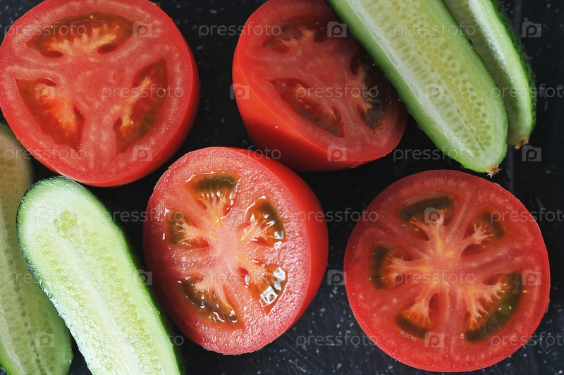 Красные помидоры и огурцы, разрезанные на половинки — вид сверху