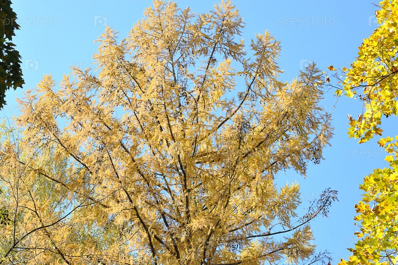 Осенний пейзаж - желтые еловые листья на синем фоне