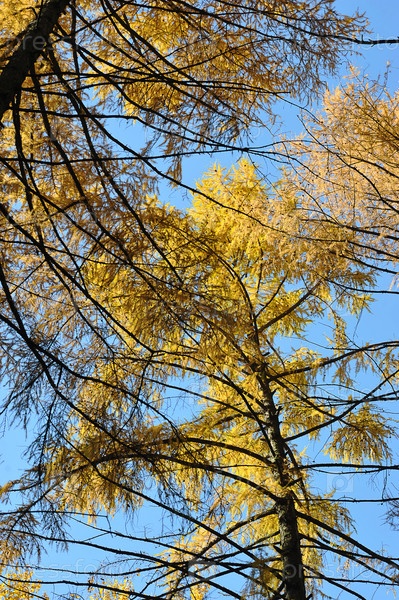 Осенний лес в солнечный день - еловые ветки на фоне голубого неба