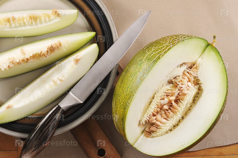 Нарезанная дыня, ломтики дыни и нож на фоне крафт-бумаги