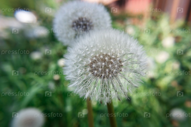 Пушистые белые головы одуванчика крупным планом в солнечный летний день