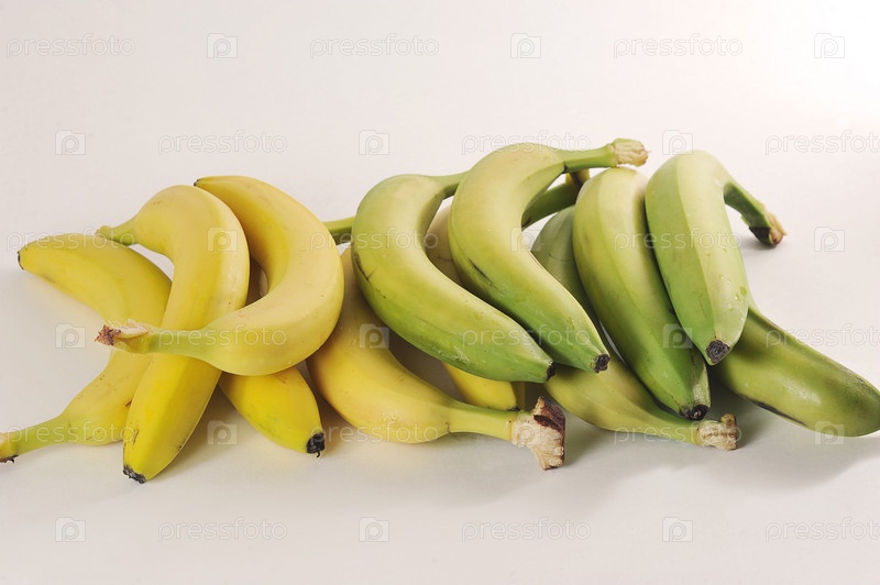 Зеленые и желтые бананы на белом фоне