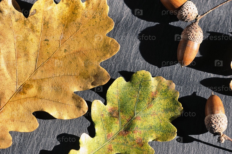 Дубовые листья и желуди на черном фоне