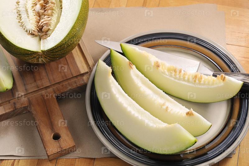 Нарезанная дыня, ломтики дыни и нож