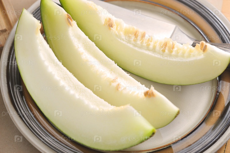 Ломтики дыни на тарелке и ноже