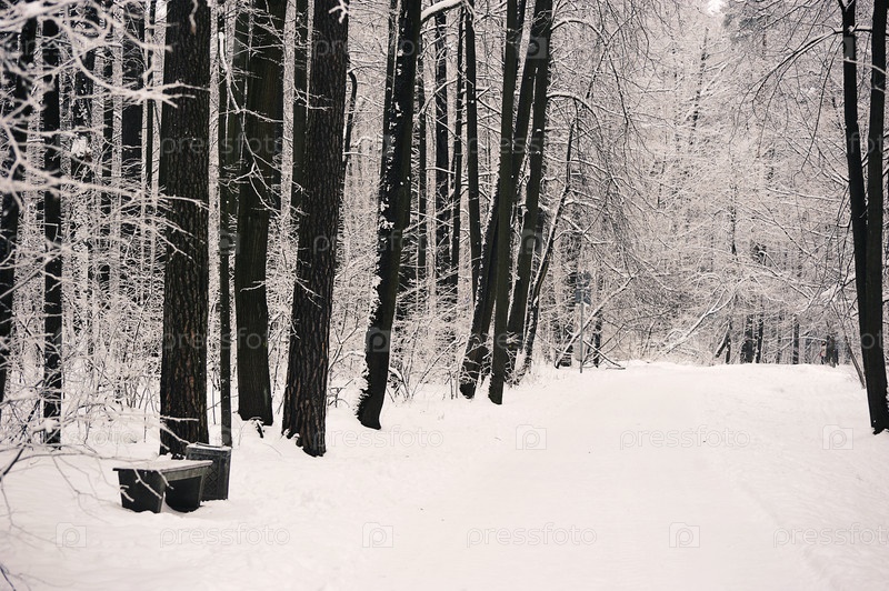 Заснеженные деревья в парке после снегопада - в снегу и морозе