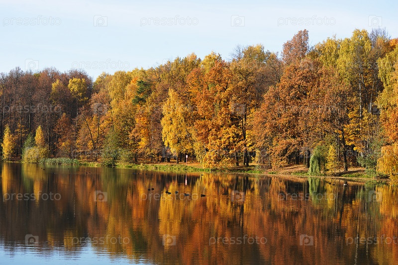 Спокойный осенний парк с опавшими листьями и прудом