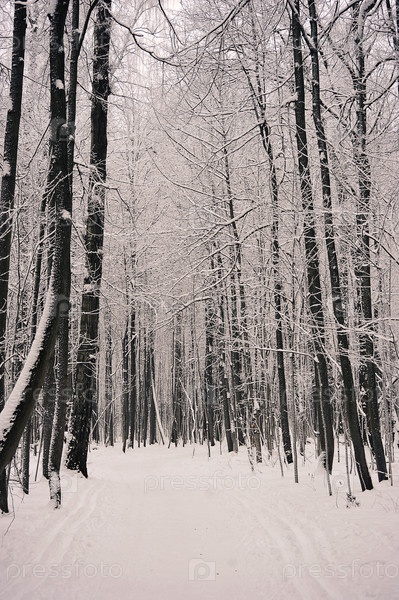 Заснеженные деревья в парке после снегопада - в снегу и морозе