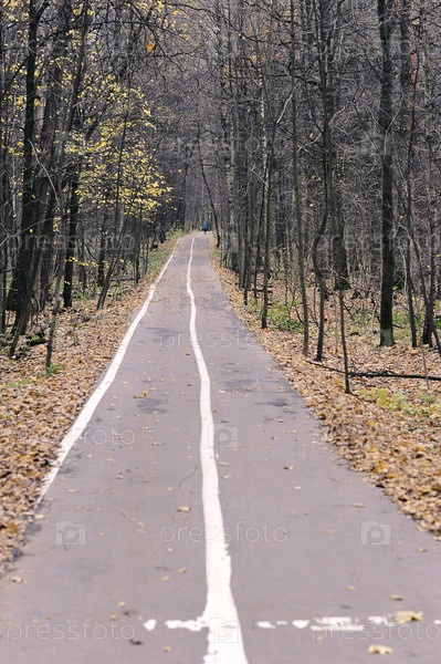 Спокойный осенний парк с опавшими листьями на пути