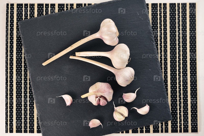Молодой чеснок - целые головки и зубчики чеснока на черной каменной доске