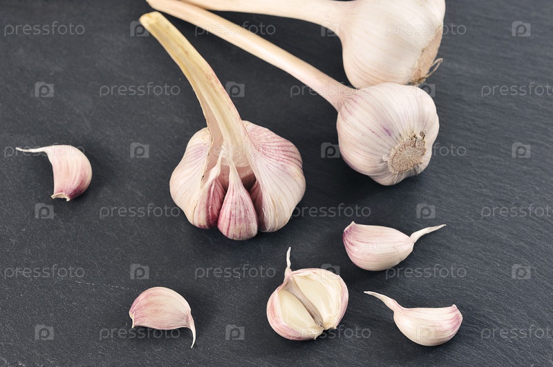 Молодой чеснок - целые головки и зубчики чеснока на черной каменной доске