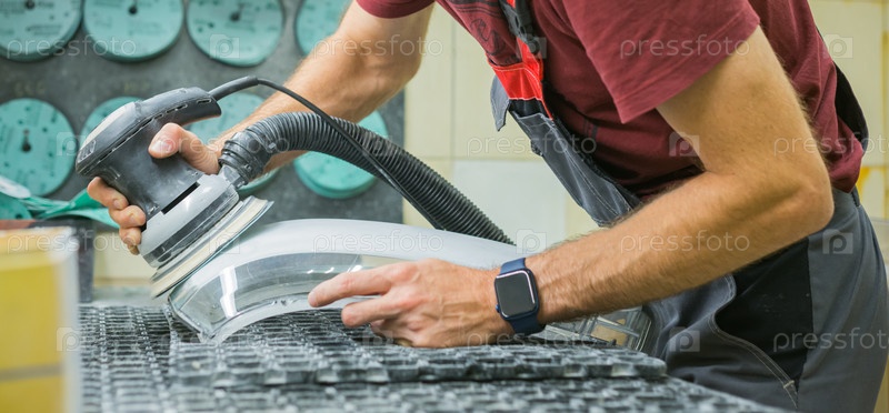 Человек делает фару чистой с помощью полировальной машины. Крупный план. Мастер-ремонтник полирует фары автомобиля в мастерской с помощью машины крупным планом