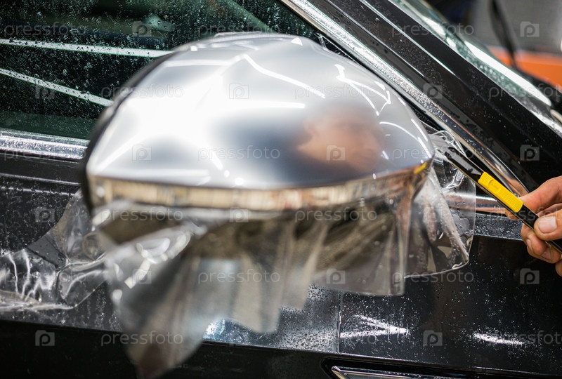 Процесс установки ППФ на боковое зеркало. Упаковка автомобиля крупным планом