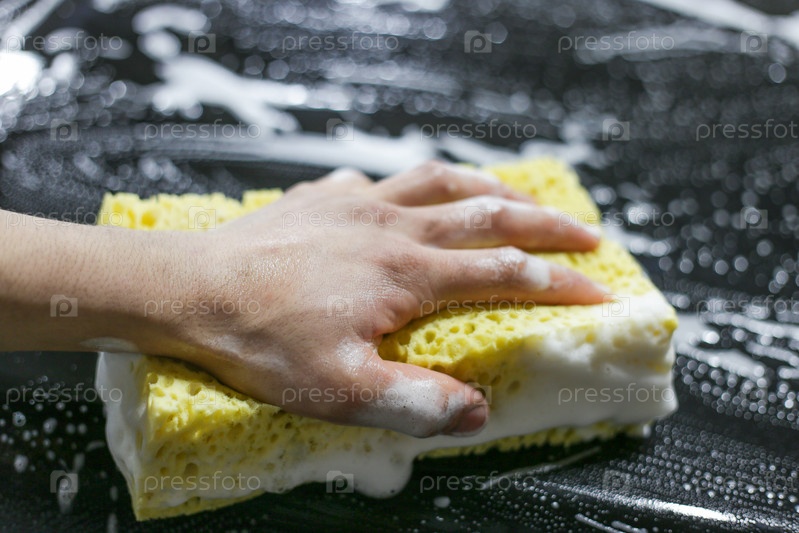 Серия детализации автомобилей: Крупный план ручной чистки черного автомобиля военнослужащего. Мойка автомобиля губкой. Мужчина моет машину желтой губкой