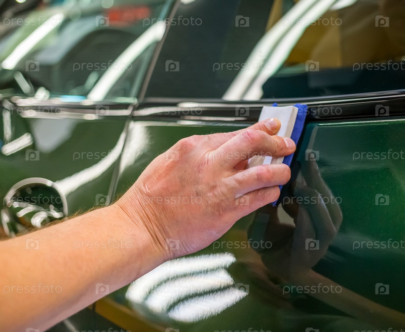 Работник автосервиса наносит нанопокрытие на детали автомобиля крупным планом. Крупный план ручного покрытия зеленой краской капота автомобиля. Автомобильная керамика