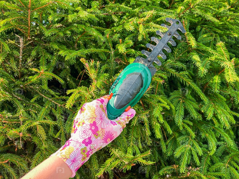 Рука садовника в защитных перчатках вырезает с помощью секатара живую ограду из тиса, подстриженную Taxus baccata
