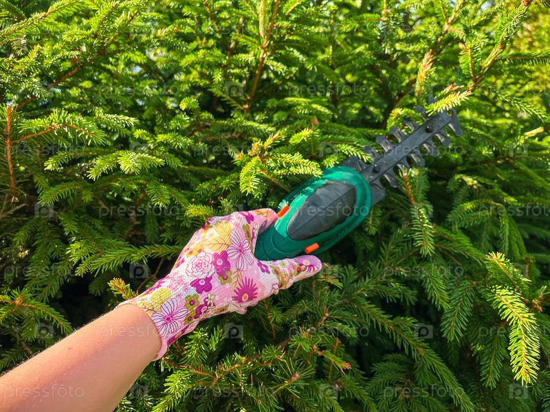 Рука садовника в защитных перчатках вырезает с помощью секатара живую ограду из тиса, подстриженную Taxus baccata