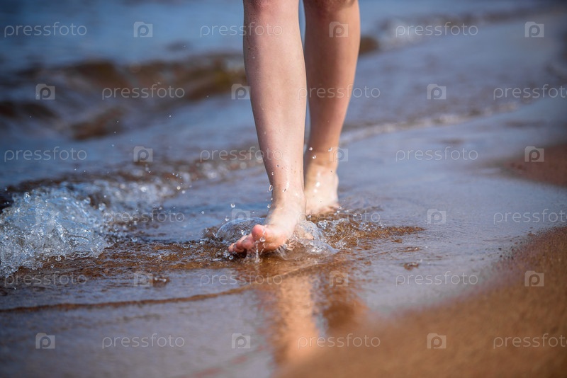 Ноги девушки идут по берегу моря в воде