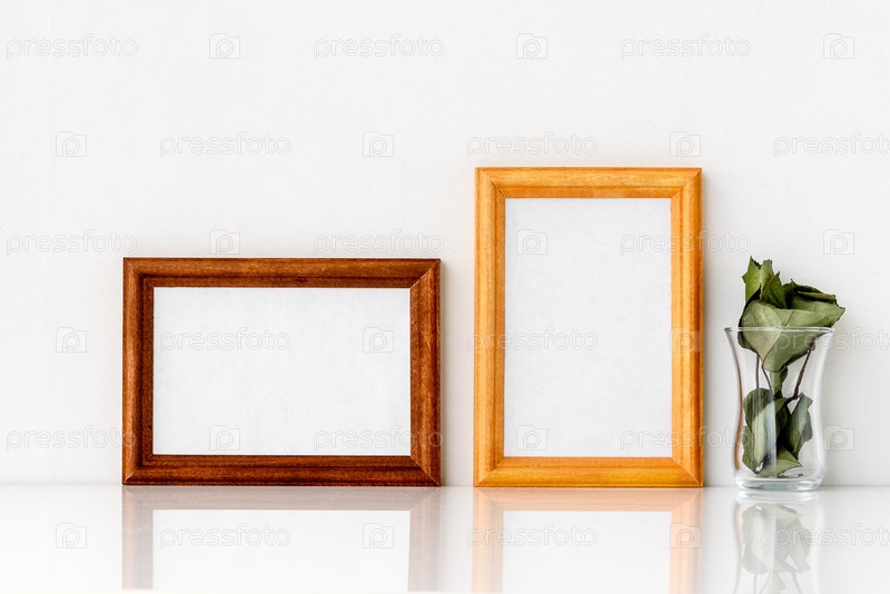 Две деревянные рамы с белой вставкой внутри и зеленой со стеклом. Фоторамка на фоне белой стены