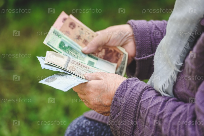 Старуха рассматривает банкноты - руки и деньги крупным планом