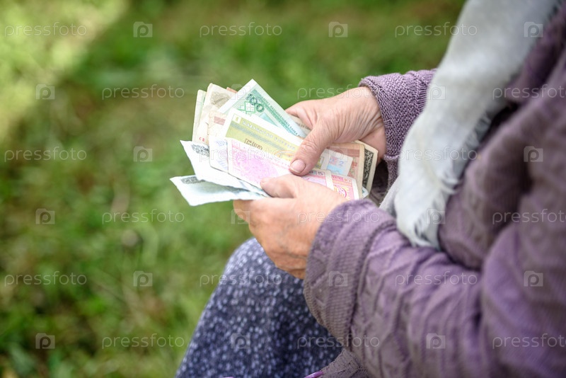 Старуха рассматривает банкноты - руки и деньги крупным планом