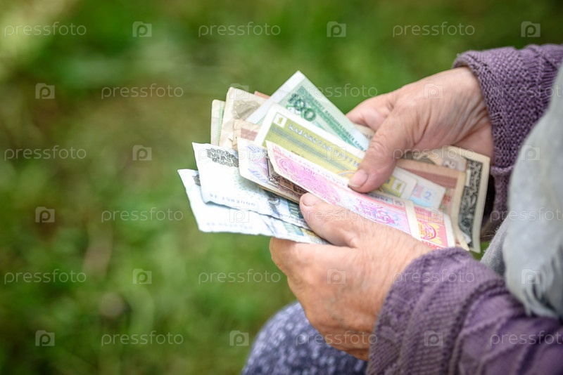 Старуха рассматривает банкноты - руки и деньги крупным планом