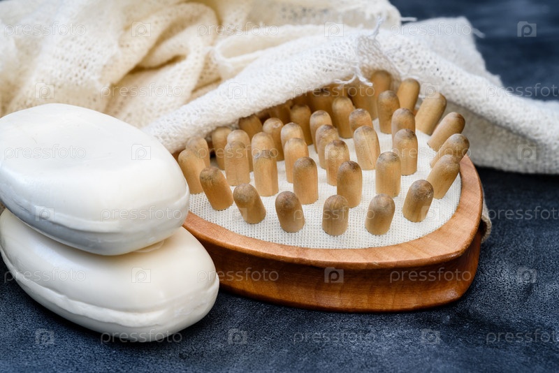 Туалетное мыло, щетка и махровая ткань - банные принадлежности